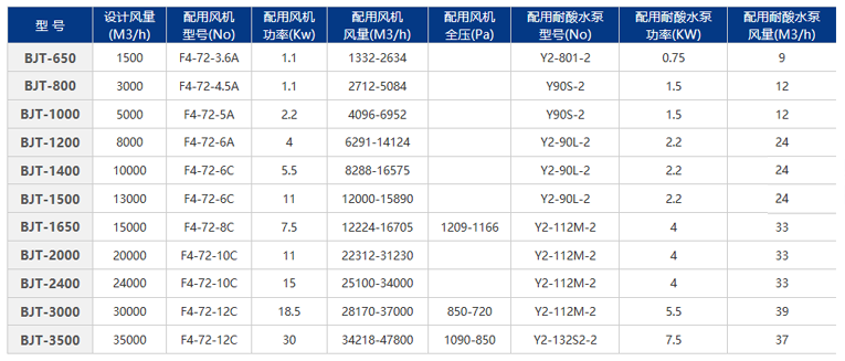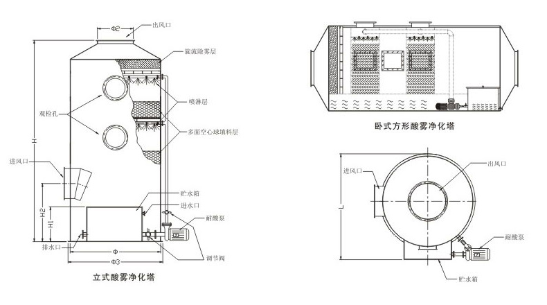 BJT series FRP/plastic purification tower Equipment principle: For the treatment of corrosive gases (such as acid and alkaline waste gas), liquid absorption method is currently used for treatment. The use of liquid absorption to treat this exhaust gas is the choice of purification equipment. At present, our company has independently developed acid and alkaline waste gas purification processes and equipment with high purification efficiency, simple operation and management and long service life. The process and the product have the characteristics of simple structure, low energy consumption, high purification efficiency and wide application range, and can effectively remove hydrogen chloride gas (HCl), hydrogen fluoride gas (HF), ammonia gas (NH3), sulfuric acid mist (H2SO), Water-soluble gas such as chromic acid mist (CrO), hydrogen cyanide gas (HCN), alkali vapor (NaOH), hydrogen sulfide gas (H2S), formalin (HCHO). The acid mist exhaust gas is introduced into the purification tower by the air duct, and passes through the packing layer. The exhaust gas and the sodium hydroxide absorption liquid are fully contacted by the gas-liquid two-phase to absorb the neutralization reaction, and the acid mist exhaust gas is purified, and then dehydrated and defogged by the defogging plate. The fan is discharged into the atmosphere. After the bottom of the tower is pressurized by the water pump, the absorption liquid is sprayed on the top of the tower, and finally returned to the bottom of the tower for recycling. The purified acid mist exhaust gas meets the emission requirements of local emission standards in Guangdong Province and is lower than the national emission standard. Features of the equipment: This equipment uses packed tower to purify the exhaust gas, suitable for the treatment of continuous and intermittent exhaust gas; the process is simple, the management, operation and maintenance are quite convenient and concise, and will not have any impact on the production of the workshop; At the same time purify a variety of pollutants; low pressure drop, high flexibility, and good defogging performance; tower body can be made of FRP/PP/PVC and other materials according to the actual situation; filler with high efficiency, low resistance of Bauer The ring can completely remove odors, harmful substances and the like in the gas.